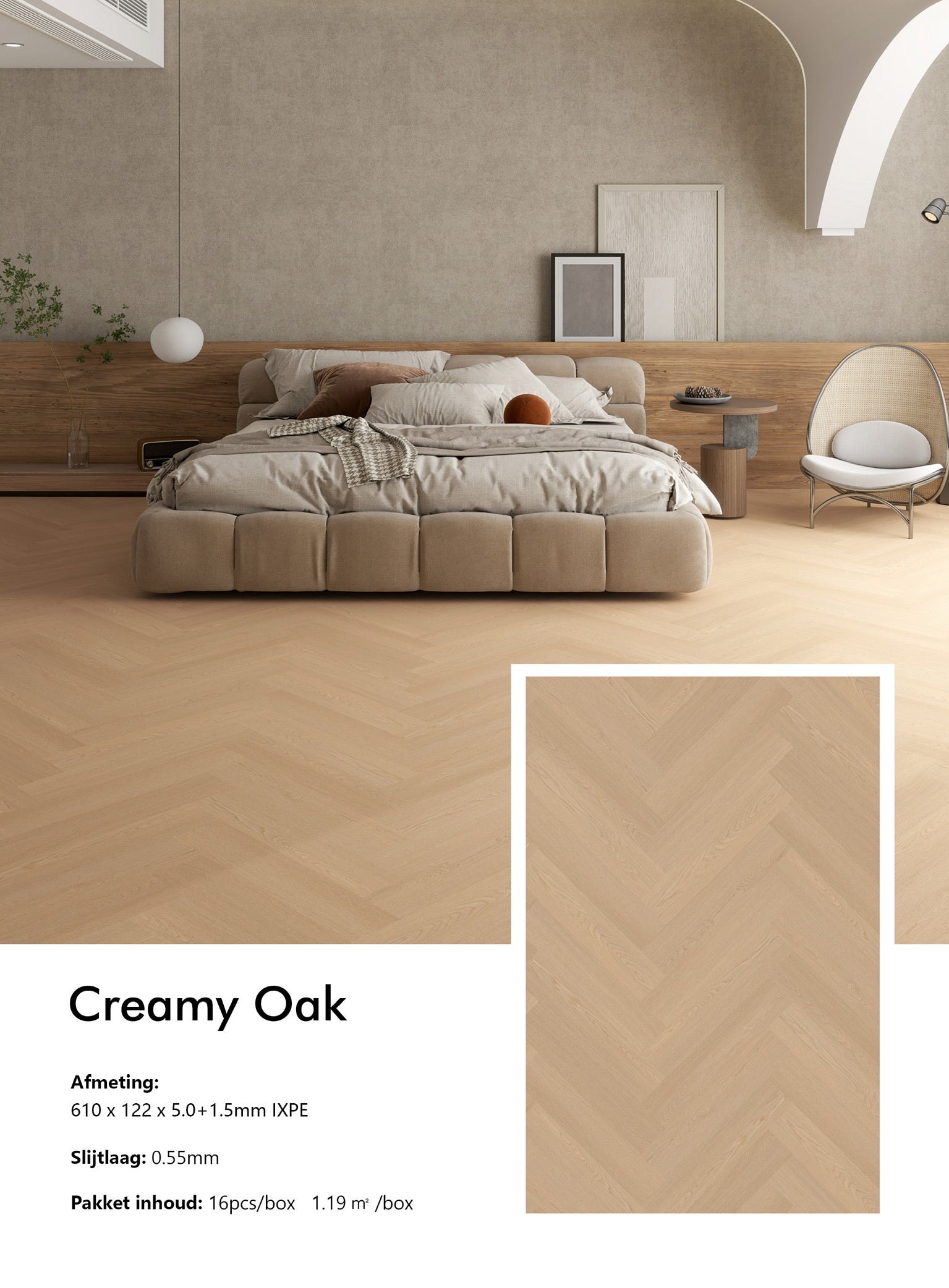Ondervloer: 1.5 mm IXPE geluiddempende & vochtbestendige onderlaag